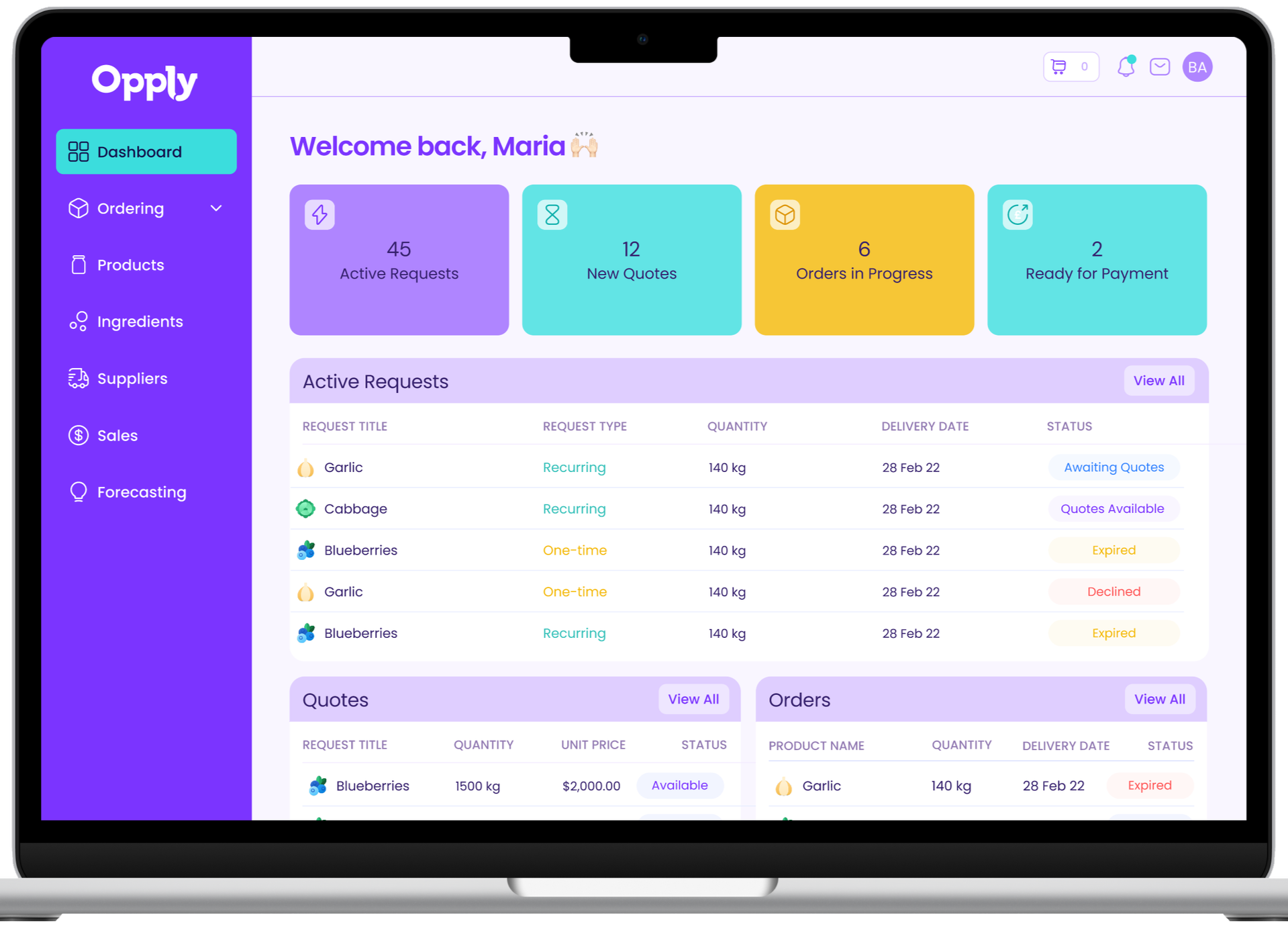 A dashboard redesign that transformed Opply’s ingredient-sourcing platform into a clear, confident workspace - helping food and beverage brands go from “Where do I start?” to “Order confirmed.”